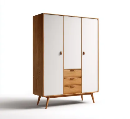 Questo armadio dal design moderno combina linee pulite e materiali naturali offrendo una soluzione elegante per organizzare la camera da letto. Le tre ante e i cassetti inferiori permettono di gestire in modo ordinato indumenti e oggetti personali.