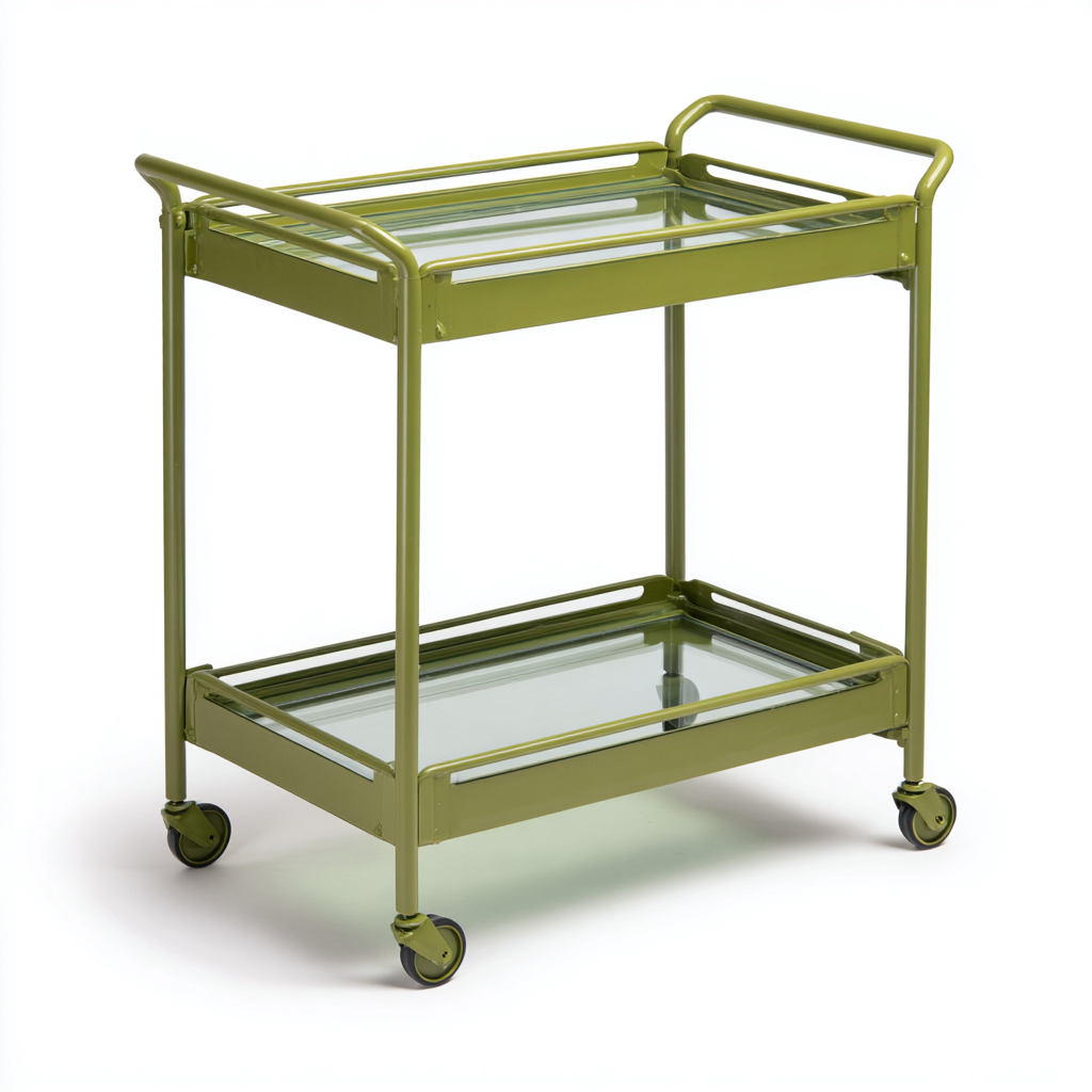 I due ripiani offrono spazio sufficiente per utensili da cucina, condimenti o articoli da servizio. Le ruote orientabili rendono agevole lo spostamento del carrello, adattandosi facilmente alle esigenze domestiche.