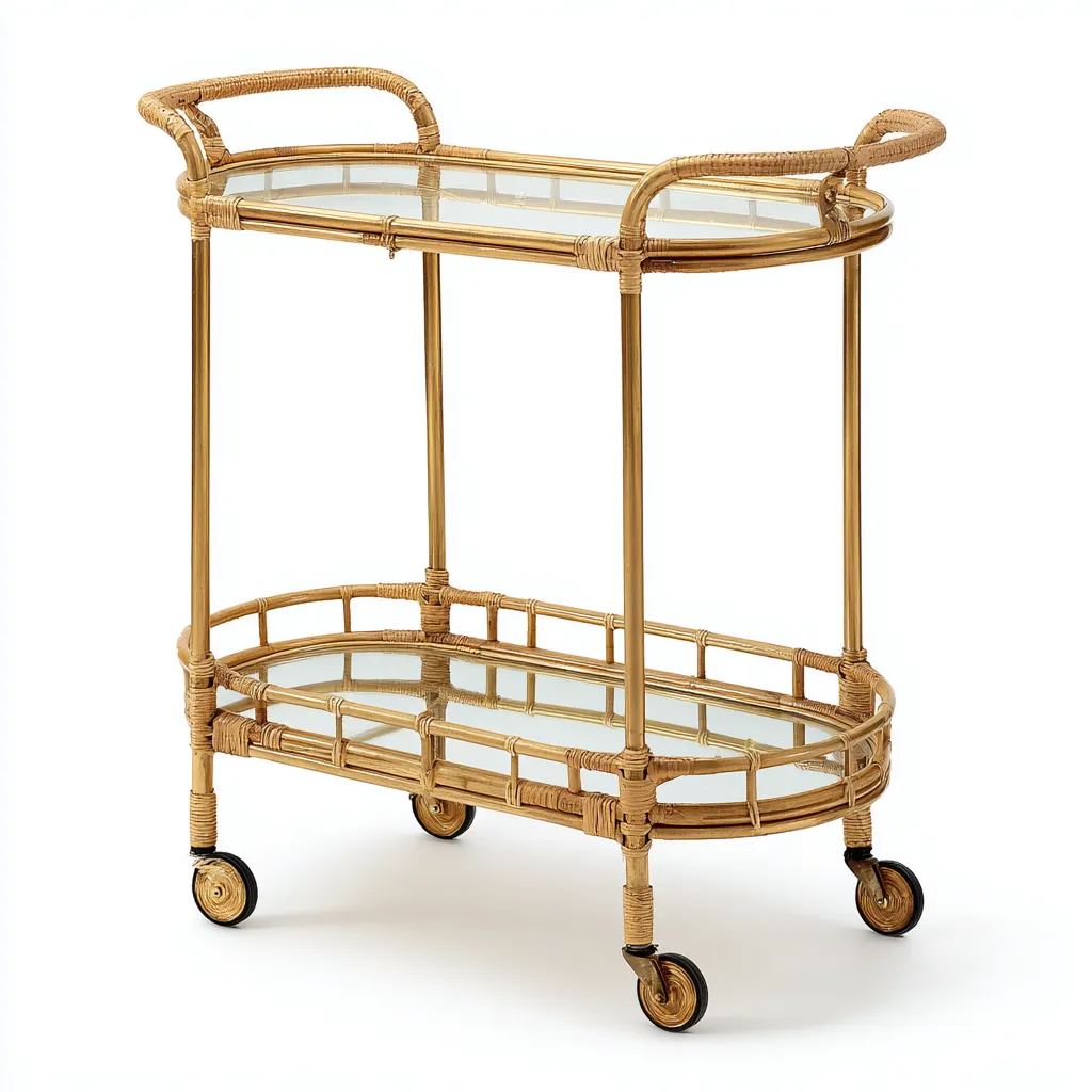 Questo carrello da cucina a due ripiani combina rattan intrecciato e vetro, offrendo un aspetto naturale e leggero ideale per ambienti domestici. La struttura elegante e la facilità di movimento lo rendono un complemento funzionale per l'organizzazione della cucina.