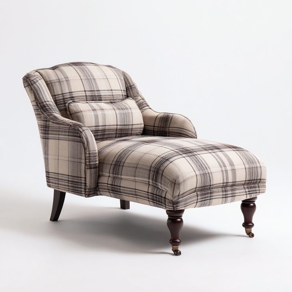 Questa chaise longue in tessuto beige con motivo scozzese si distingue per uno stile classico e accogliente, ideale per creare un angolo di relax elegante all'interno del soggiorno.