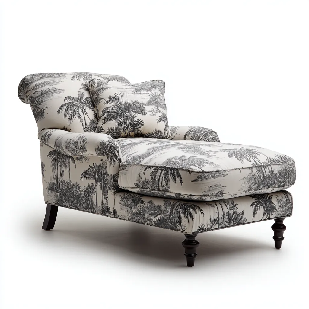 Questa chaise longue in tessuto grigio con motivo decorativo presenta uno stile classico elegante, ideale per aggiungere un punto di relax raffinato all'interno del soggiorno.