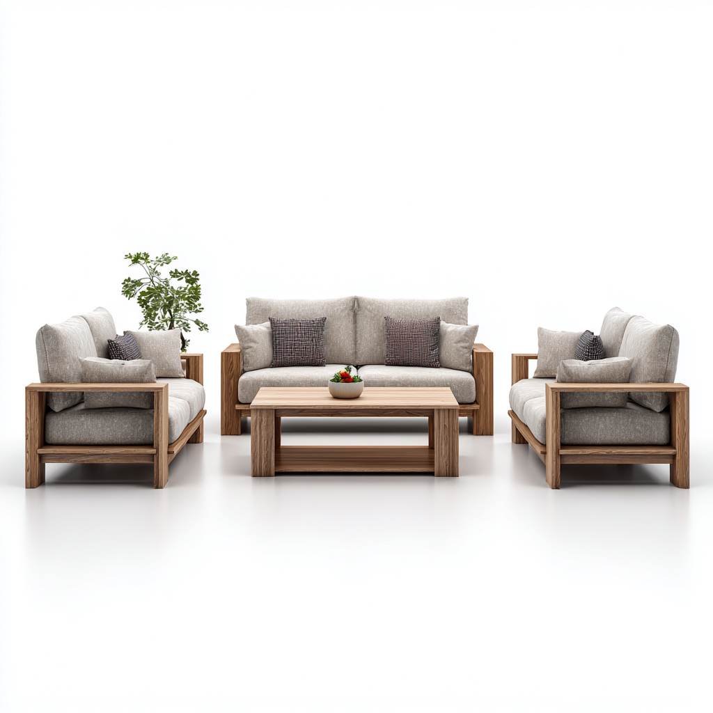 Questo divano componibile in tessuto grigio presenta un design moderno e naturale, caratterizzato da una struttura in legno a vista e da una seduta confortevole. È ideale per creare un ambiente accogliente e luminoso nel soggiorno.