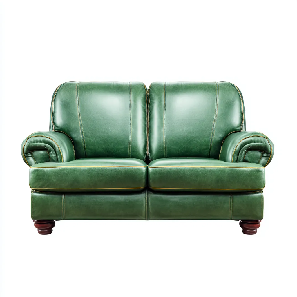 Il rivestimento in similpelle verde è resistente e facile da mantenere. Le cuciture decorative evidenziano il profilo del divano, mentre l'imbottitura uniforme e la struttura stabile garantiscono un buon livello di comfort.