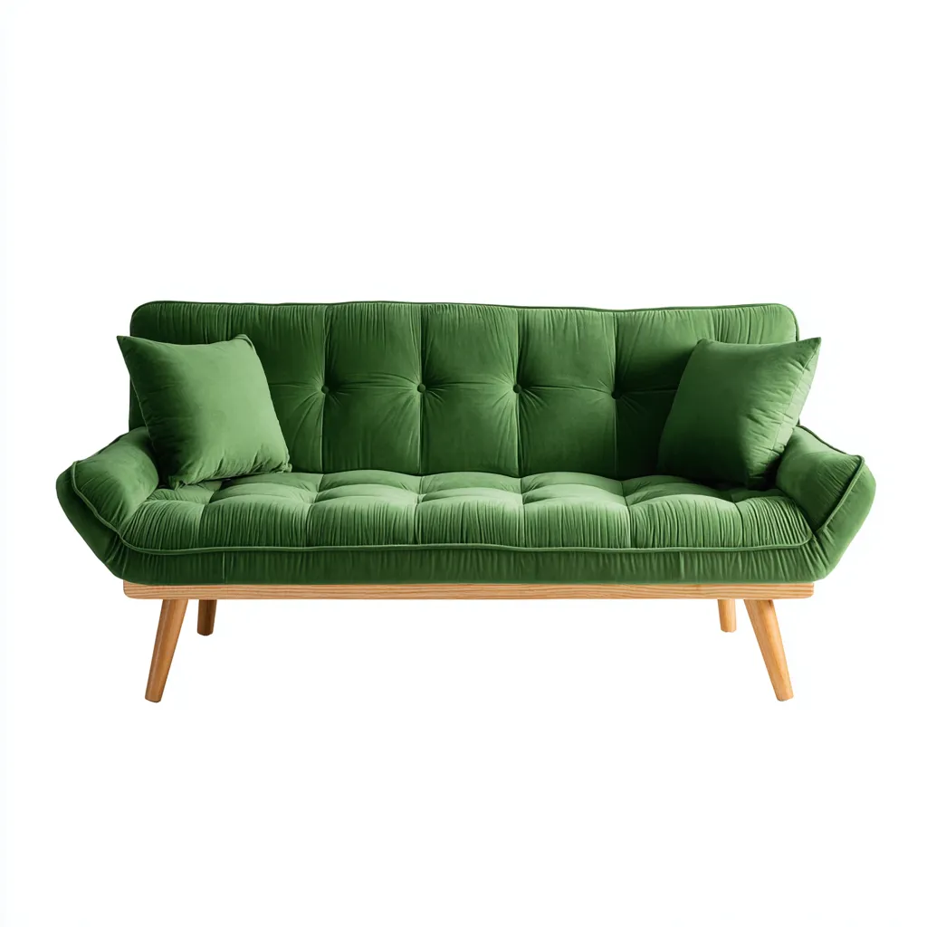 Questo divano lineare in tessuto verde presenta un'estetica moderna e leggera, offrendo una seduta confortevole adatta ad ambienti domestici contemporanei e versatili.