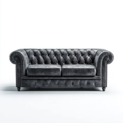 Il rivestimento in tessuto grigio è morbido al tatto e resistente all'uso quotidiano. La lavorazione capitonné sullo schienale e sulla struttura frontale aggiunge un carattere decorativo distintivo, mentre l'imbottitura uniforme garantisce un comfort stabile.