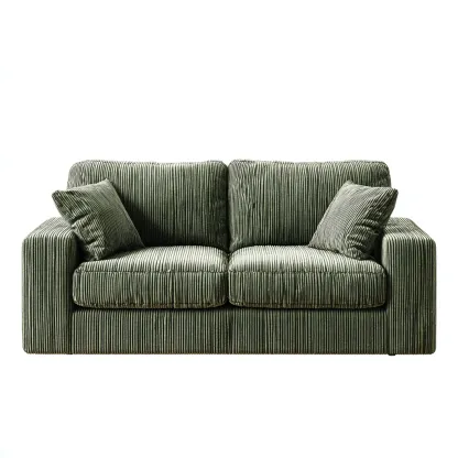 Questo divano lineare in tessuto verde offre un'estetica moderna e una seduta morbida, ideale per creare un ambiente accogliente e contemporaneo nel soggiorno.