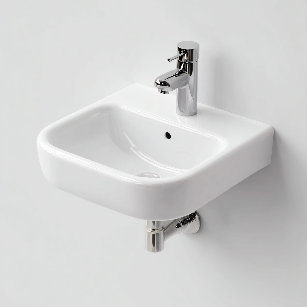 Questo lavabo in ceramica bianca è progettato per l'installazione a parete, offrendo una soluzione compatta e funzionale ideale per bagni moderni e spazi limitati.