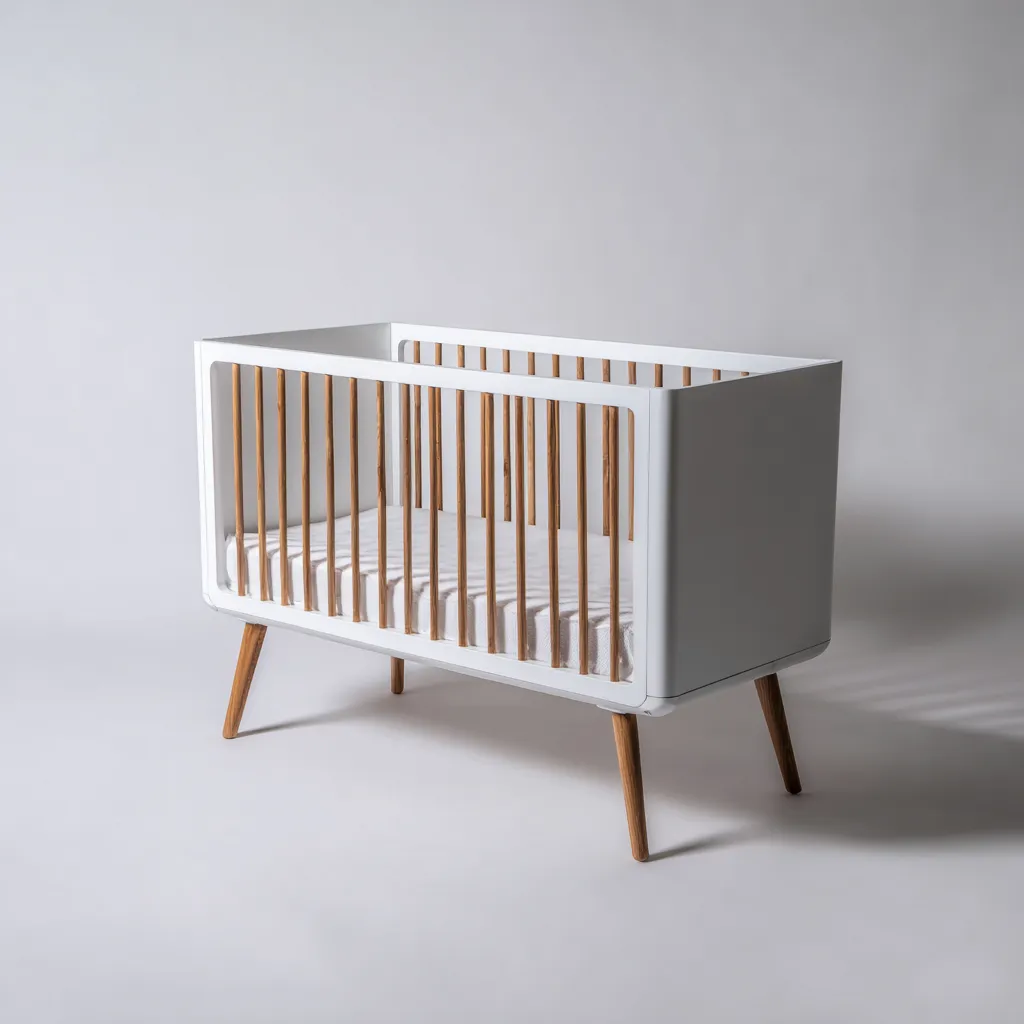 Questo lettino per bambini è caratterizzato da una struttura moderna con pannelli bianchi e sbarre in legno naturale, offrendo un'estetica pulita e contemporanea adatta alla camera da letto. Il design arrotondato e le gambe alte donano leggerezza visiva, contribuendo a creare un ambiente ordinato e accogliente.