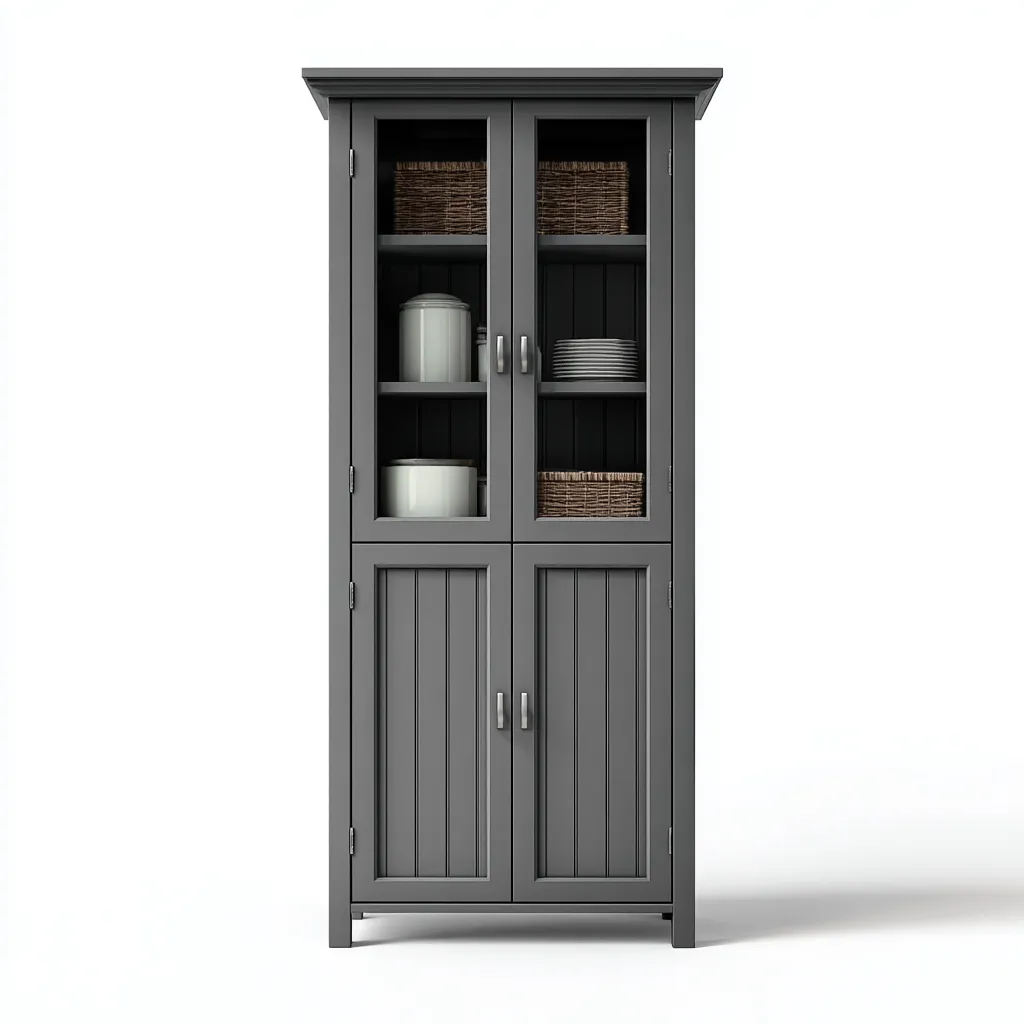 Il mobile è realizzato in legno composito con finitura grigio opaco che conferisce un aspetto elegante e versatile. Le ante superiori con inserti in vetro permettono di esporre gli oggetti in modo ordinato mentre la superficie è facile da pulire e resistente all'uso quotidiano.