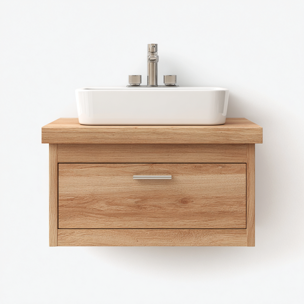 Questo mobile lavabo sospeso dal design moderno presenta una finitura in legno naturale, ideale per aggiungere un aspetto caldo e armonioso all'ambiente bagno.
