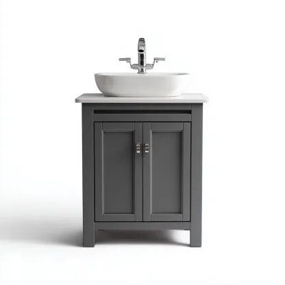 Questo mobile lavabo dal design moderno offre una finitura in grigio scuro e una struttura compatta, ideale per arricchire ambienti bagno dallo stile contemporaneo.