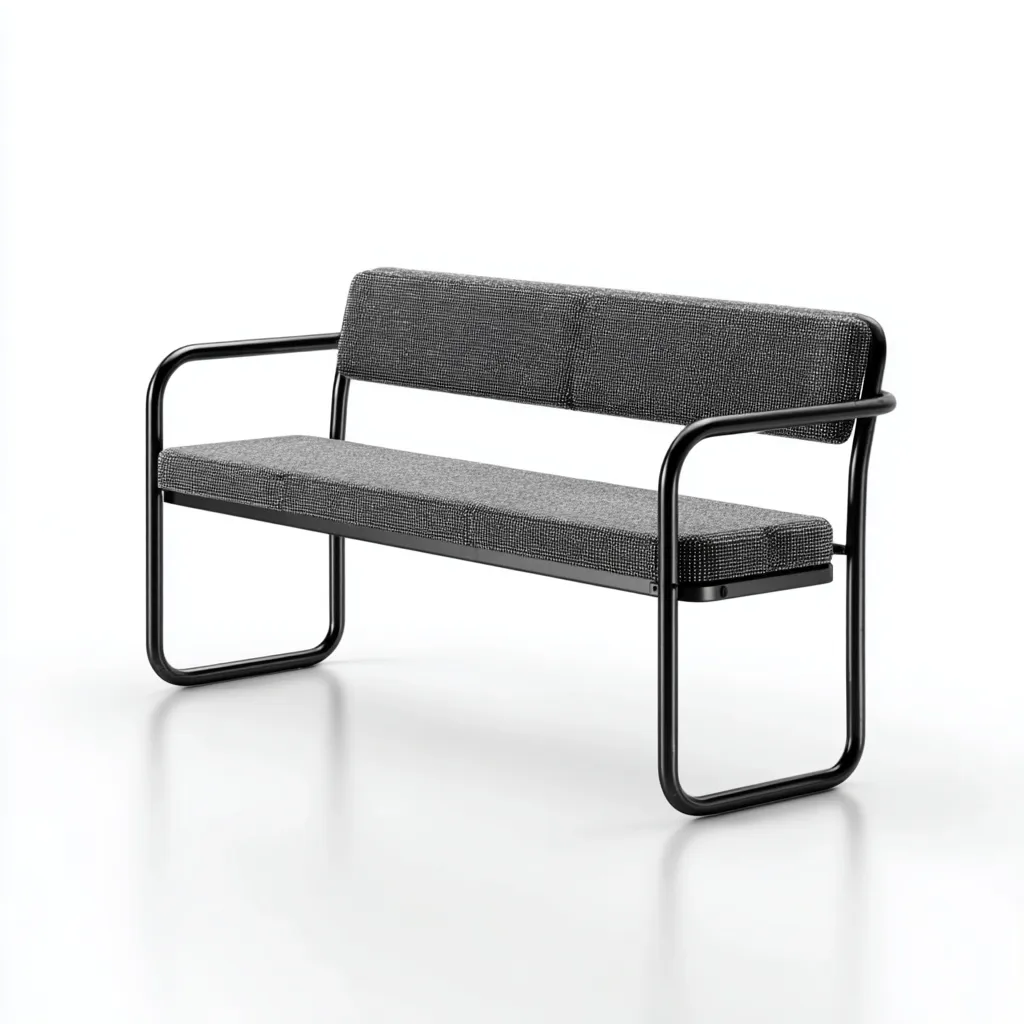 La panca è realizzata con telaio in metallo verniciato nero mentre la seduta e lo schienale sono imbottiti e rivestiti in tessuto grigio. Le superfici sono curate per garantire stabilità e resistenza all'uso esterno.
