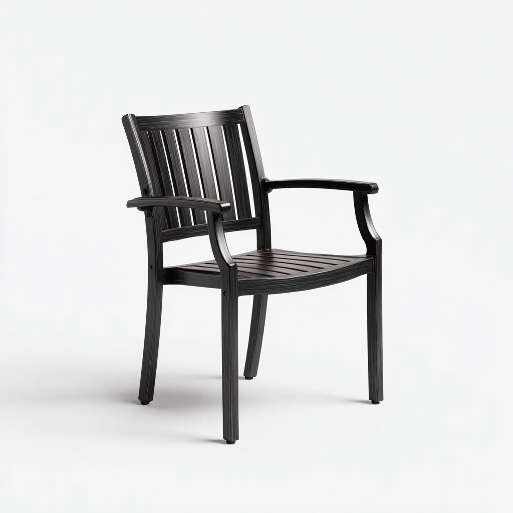 La poltrona è realizzata in legno robusto con finitura nera che richiama l'effetto naturale delle venature. La struttura è progettata per garantire stabilità e lunga durata all'esterno con una manutenzione minima.