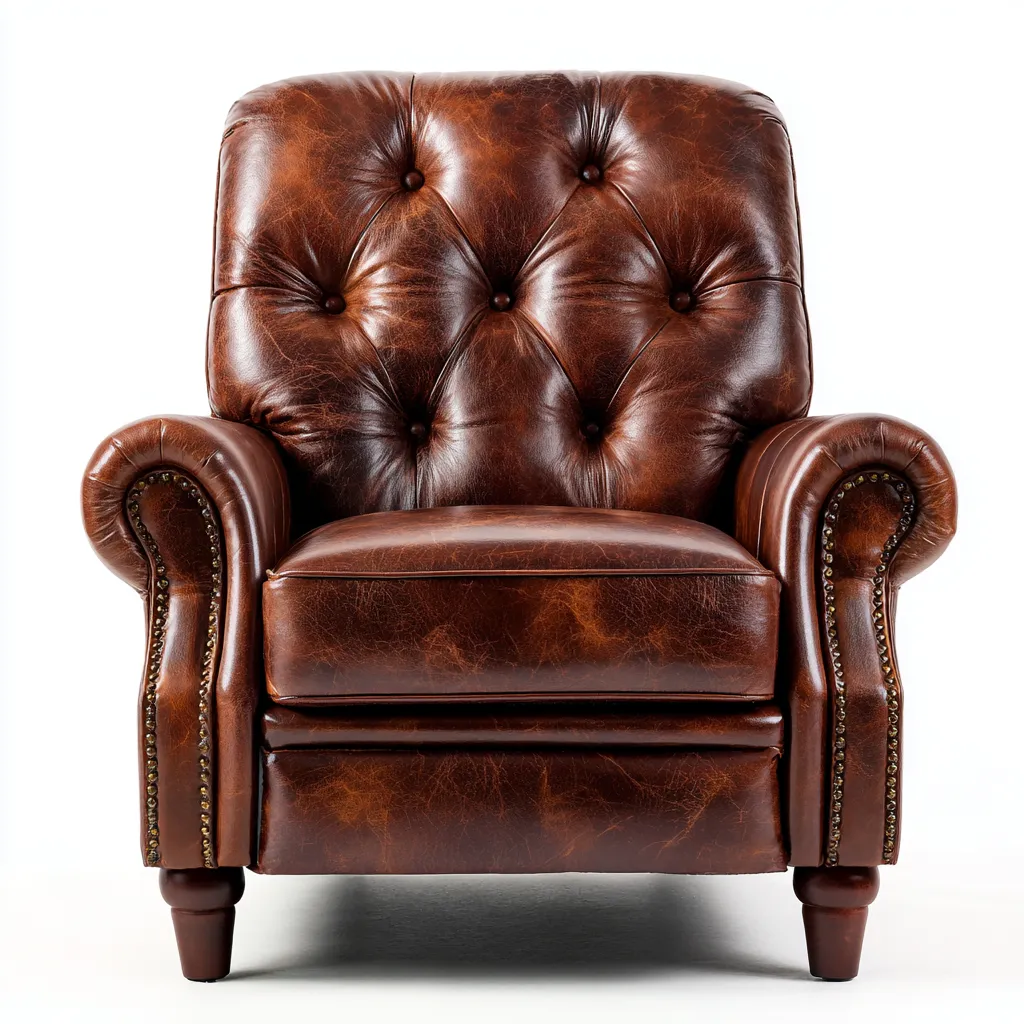 Questa poltrona reclinabile in pelle naturale marrone presenta uno stile vintage con lavorazione capitonné e braccioli sagomati. Offre un comfort elevato ed è ideale per creare un'atmosfera elegante e accogliente in soggiorno.