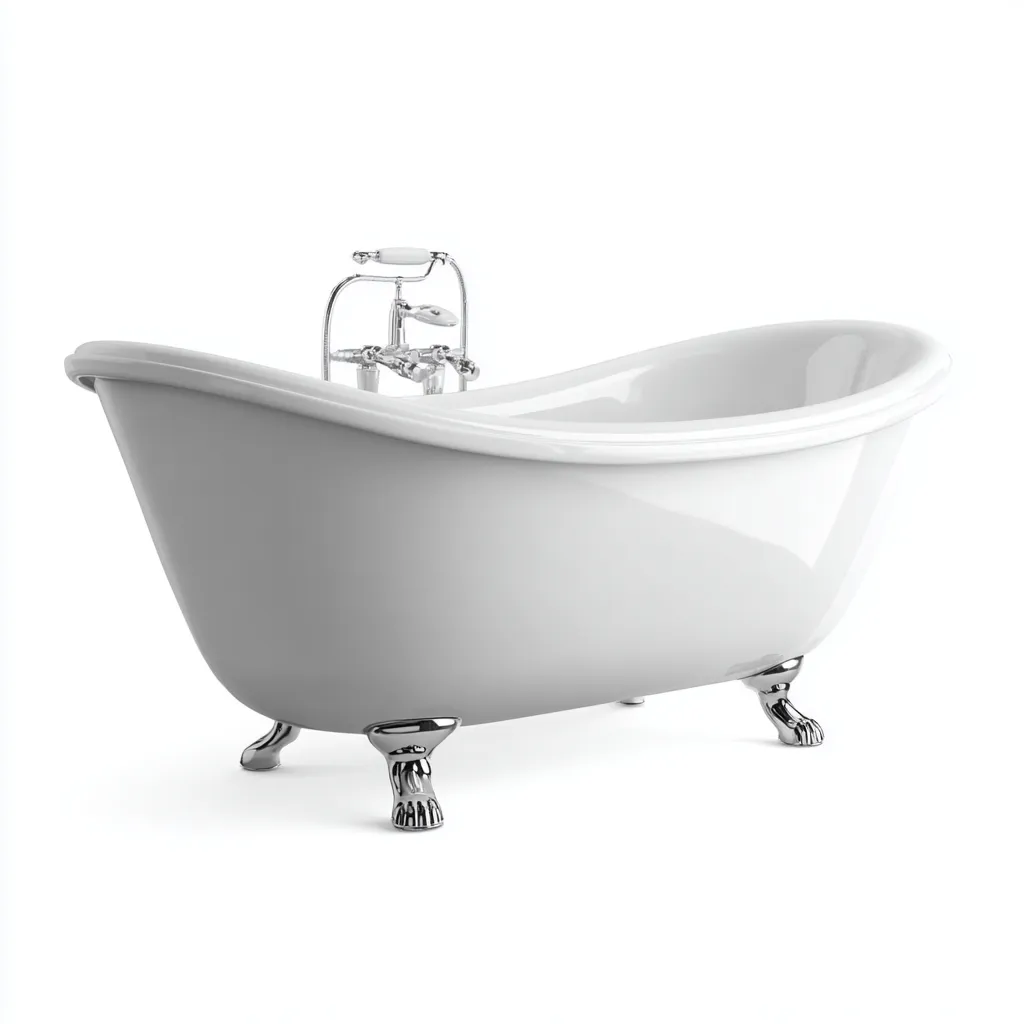 La vasca è realizzata in acrilico resistente di colore bianco, con piedini decorativi e componenti metalliche in finitura lucida. La superficie liscia garantisce facilità di pulizia e buona durata nel tempo.