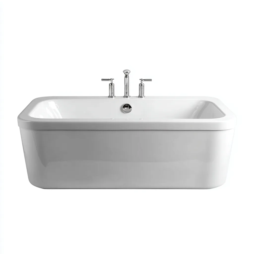Questa vasca da bagno freestanding dal design moderno presenta una forma rettangolare con angoli arrotondati che dona eleganza e comfort. La zona superiore ospita tre fori per l'installazione di un miscelatore, rendendo il prodotto adatto a diversi tipi di configurazione del bagno.