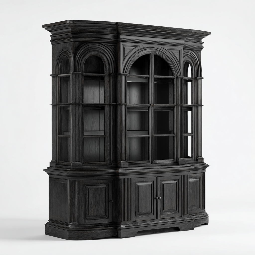 La struttura è realizzata in legno massiccio con finitura nera, resistente e progettata per durare nel tempo. Le ante superiori sono dotate di pannelli in vetro trasparente con elementi arcuati decorativi, mentre la parte inferiore presenta ante in legno chiuse per la conservazione discreta di utensili o altri oggetti. Le cornici scolpite e i dettagli verticali arricchiscono ulteriormente l'estetica del mobile.