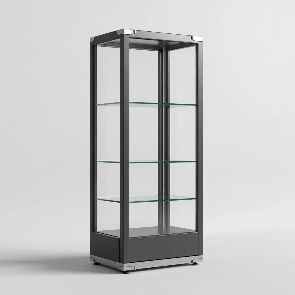 La struttura è realizzata in metallo con finitura nera, stabile e resistente. I pannelli trasparenti in vetro temperato garantiscono una visione chiara del contenuto, mentre i ripiani interni in vetro offrono solidità e supporto adeguato. Le giunzioni metalliche rinforzate assicurano una lunga durata.